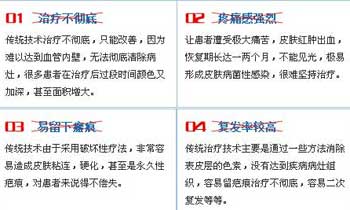 第二个冷冻治疗,治疗缺乏选择性,是从皮肤表面一层一层地由表及里地冻伤组织,由于病损部位深,所以冷冻治疗极易留下瘢痕。事实上冷冻治疗深度是不够的,难以达到理想的疗效,事实上绝大部分病人治疗无效。