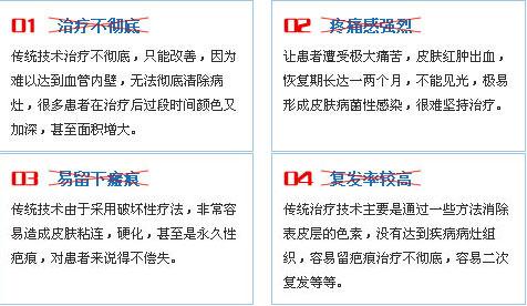 冷冻治疗: 治疗缺乏选择性,是从皮肤表面一层一层地由表及里地冻伤组织,由于病损部位深,所以冷冻治疗极易留下瘢痕。事实上冷冻治疗深度是不够的,难以达到理想的疗效,绝大部分病人利用冷冻治疗却没有效果。