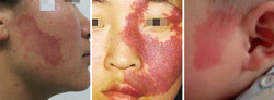 胎记分为色素型和血管型。一般来说,鲜红斑痣会随着年龄的增长,色加深,变厚和出现结节,于创伤后易于出血。贵州皮肤病医院专家介绍,鲜红斑痣又称葡萄酒样痣或毛细血管扩张痣,在出生出现,好发于面、颈部,大多为单侧性,偶为双侧性,有时累及粘膜。损害初起为大小不一或数个淡红、暗红或紫红色斑片,呈不规则形,边界清楚,不高出皮面,可见毛细血管扩张,压之部分或完全退色,表面平滑。随着年龄增长,颜色加深变红,变紫,40%的患者的病灶将逐渐扩张,在40岁前可增厚和出现结节,于创伤后易于出血。鲜红斑痣是无数扩张的后微静脉所组成的较扁平而很少隆起的斑块,属于先天性后微静脉畸形。病灶面积随身体生长而相应增大,终生不消退。