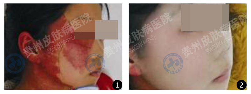 治疗史:先天性红胎记,激光治疗三次无效。经贵州皮肤病医院科学去胎记治疗两次,完全康复。