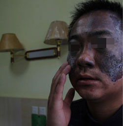 2013年12月16日,贵州,马先生苦于脸上的咖啡斑难看,赴京治疗,在贵州市某大型综合三甲医院用手术治疗咖啡斑时,出现不适。手术开始后,马先生反应剧烈。最后手术中断,咖啡斑不仅没有去除,反而脸部皮肤感染,几乎毁容。图为马先生几乎不敢想象自己的脸了。