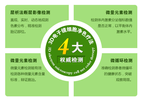 2、精准检测分级、分型、分诊,依此采取个性化治疗方案,靶向病因,由内而外祛除胎记色素。