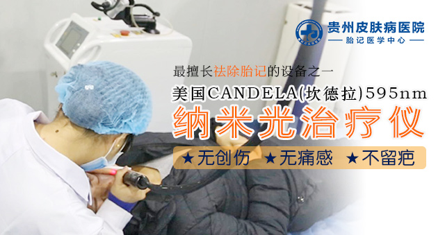 贵州皮肤病医院科学去胎记采用国内先进美国坎德拉595纳米光治疗仪,专门针对鲜红斑痣等一系列“红胎记”治疗,其优势就是较以往的激光治疗波长更长了,穿透更深了,从而使疗效较以往有了很大的提高,特别是对增厚的、深在的皮疹,治疗后不复发,同时可以保持较好的美容效果,术后恢复也快。