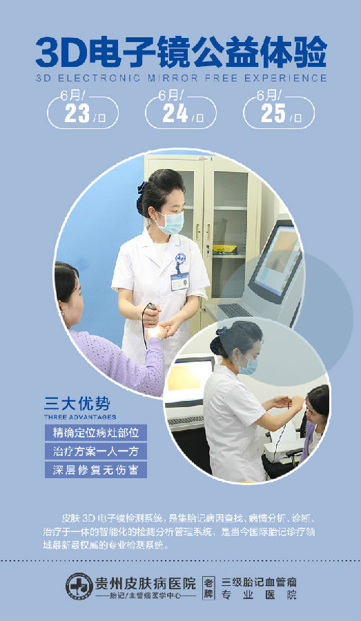 权威数据显示,胎记的种类高达百余种。很多胎记患者因为没有准确检测出自身胎记类型,所以在胎记治疗的第一步上就走错,导致后面的病情愈加难治和反复发作。所以胎记检测才是关键。为了解决以上问题,贵州皮肤病医院科学去胎记特别开展了为期三天的“皮肤3D电子镜检测系统公益体验&京黔专家联合会诊活动”(2017年6月23日-25日),目的是让广大西南地区胎记、血管瘤的患者可以精准定位胎记类型,制定出专属的个体化诊疗方案,对症施治,早日康复。