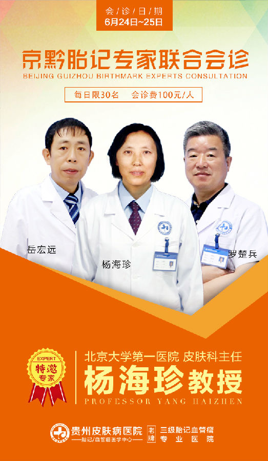 在贵州皮肤病医院科学去胎记推出“皮肤3D电子镜检测系统公益体验”的同时。特邀北京公立三甲医院北京大学第一医院的皮肤科主任杨海珍教授与6月24日-25日两天坐诊贵阳。让西南地区的胎记患者免去舟车劳顿的辛苦,在身体上、精神上、经济上大大降低负担,在家门口就能看到北京的专家。因会诊时间有限,求医患者较多。所以会诊期间每日限额30名。
